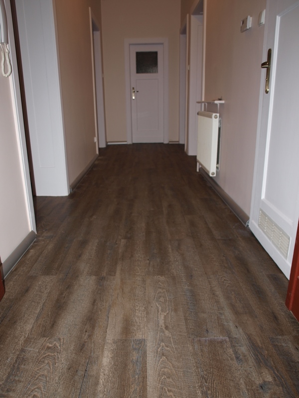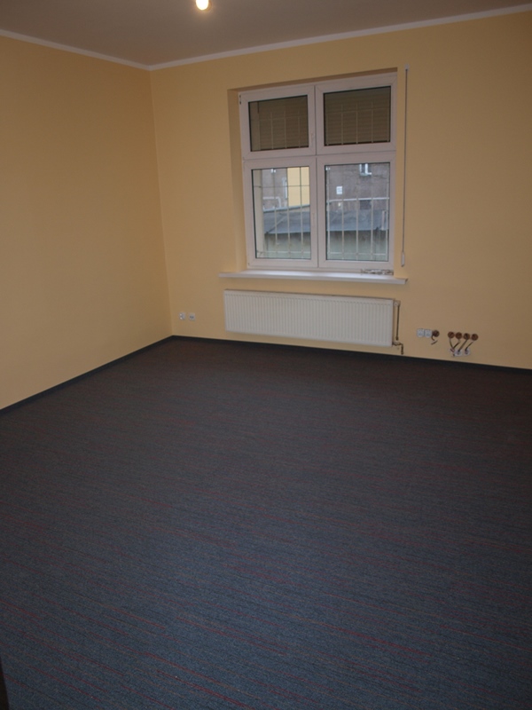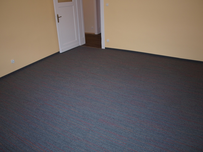 Istniejącym podłożem była podłoga drewniana, aby zmniejszyć ryzyko odwzorowania się deski na wierzchniej warstwie wykładziny zainstalowaliśmy płytę OSB. Po zaszpachlowaniu łączeń mogliśmy rozpocząć montaż płytki dywanowej w pomieszczeniach biurowych i paneli PCV na korytarzu. Zainstalowane zostały dwa rodzaje listew wykończeniowych. Do montażu użyliśmy profesjonalnej chemii Mapei.