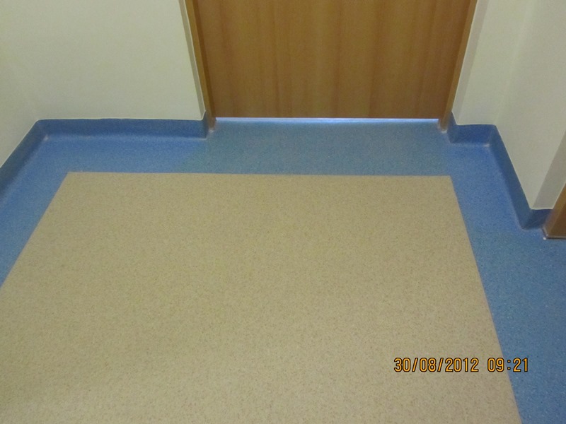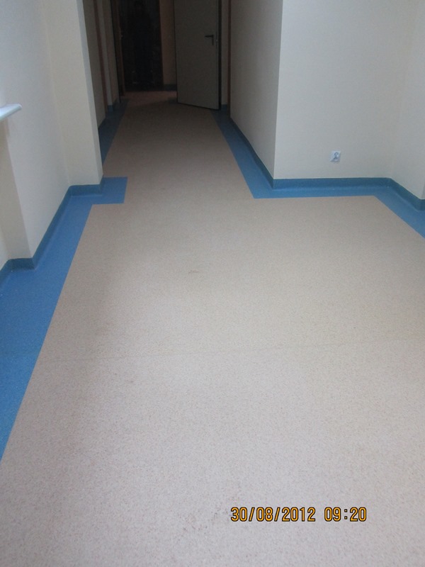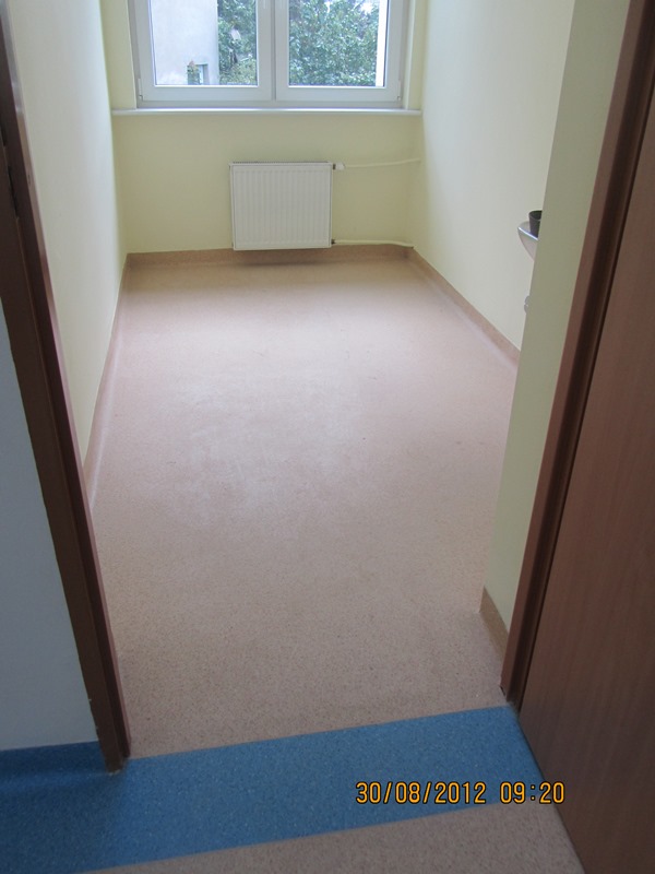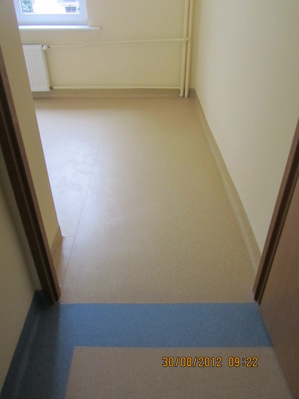 Zagruntowaliśmy podłoże odpowiednimi środkami Mapei na podłoża nienasiąkliwe i nasiąkliwe a następnie przystąpiliśmy do wykonania wylewki masy samopoziomującej Planolit 315. W chwili kiedy masa otrzymała odpowiednią wilgotność mogliśmy rozpocząć montaż wykładzin PCV z wywinięciem jej na ścianę.